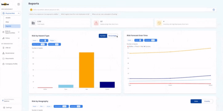 With Beehive, AI and analytics are embedded into the product. Create charts based on risk types, assets, geographies, and scenarios to easily communicate risk to stakeholders, or ask AI about your risk.